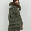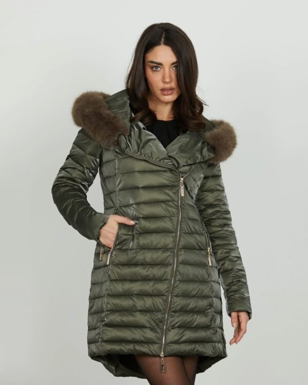 Relish long quilted jacket in polyester with a satin finish. Features a diagonal zipper, a detachable hood with faux fur, and side pockets.