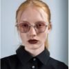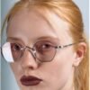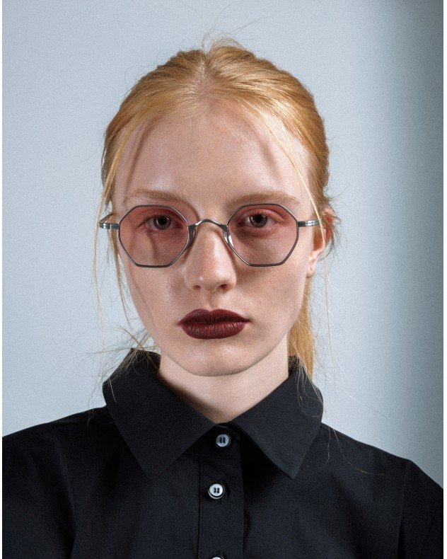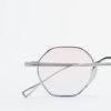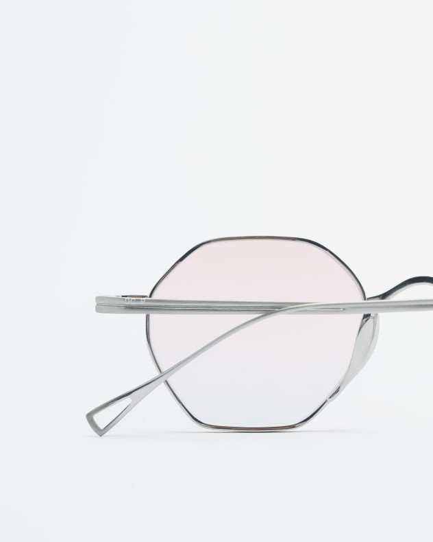 Silver sunglasses with lightweight metal frames and pink lenses.