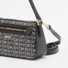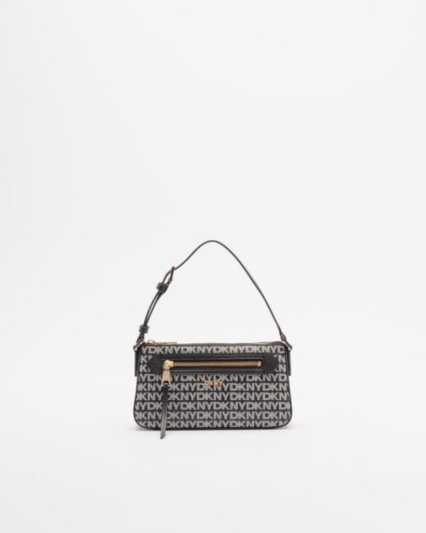 Black bag with DKNY monogram pattern and gold accents. Exterior zip pocket and metal logo on the front.