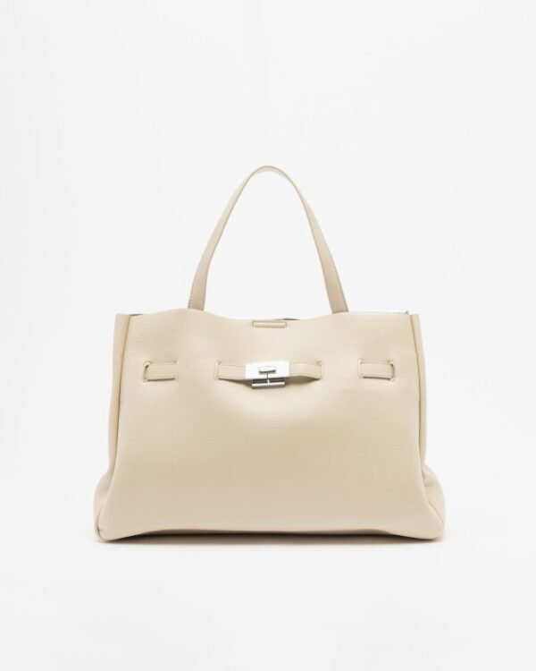 DKNY beige faux leather bag with grainy effect. Double handle and silver metal plate with DKNY logo on the front.