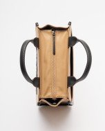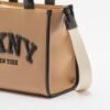 Nude faux leather bag with black details and quilted DKNY logo on the front.