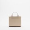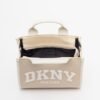 Beige faux leather bag with white details and quilted DKNY logo on the front.