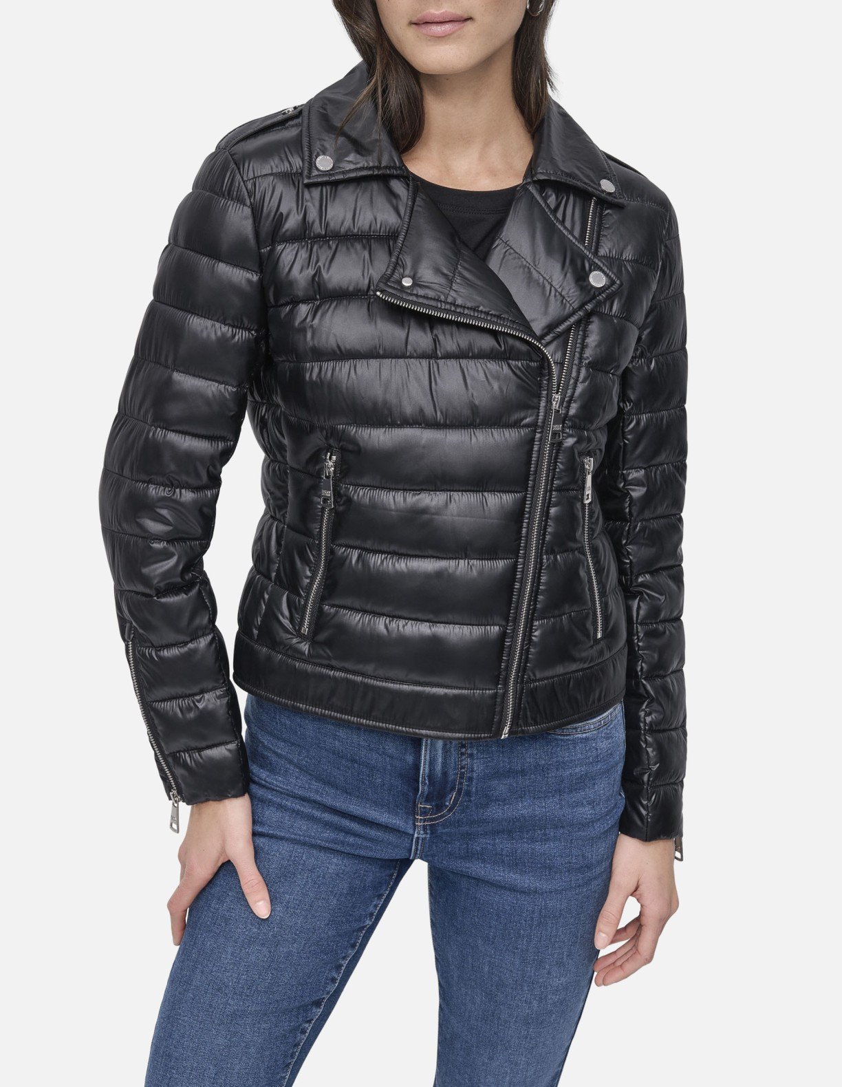 Black quilted jacket with a shiny effect and metal zippers. Exclusive DKNY Jeans details.