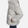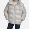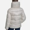 DKNY Jeans women’s white quilted puffer jacket with a shiny effect. DKNY Jeans patch on the left sleeve.