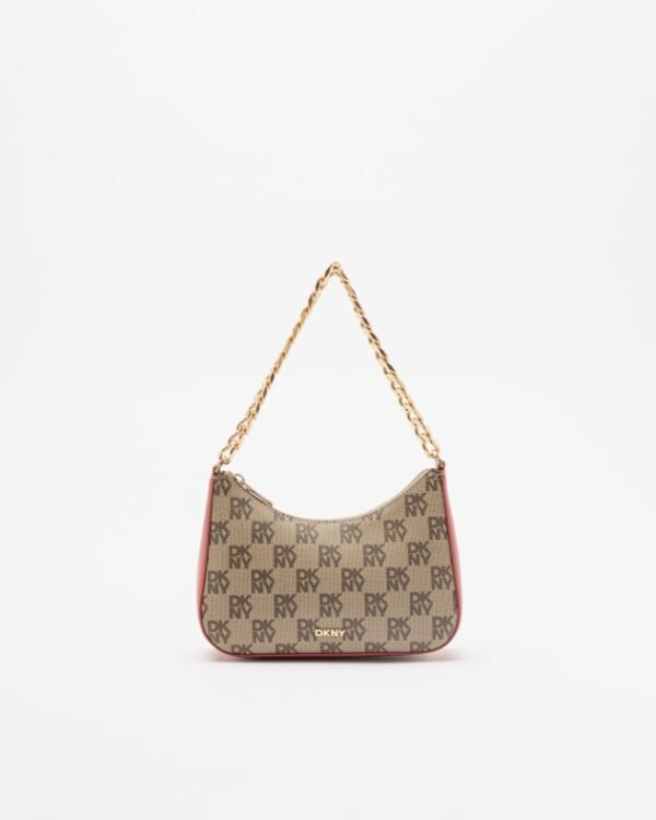 DKNY beige bag with monogram pattern and gold chain strap. Metallic logo on the front.