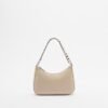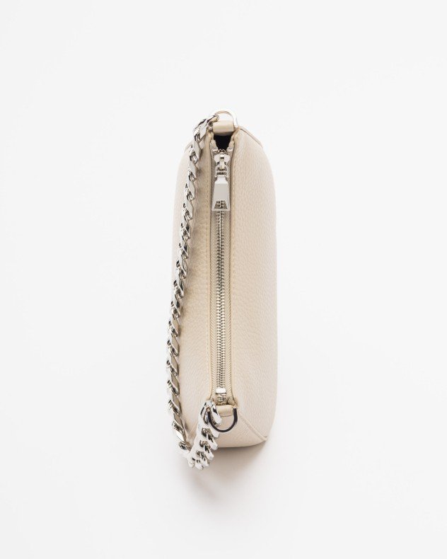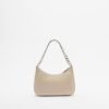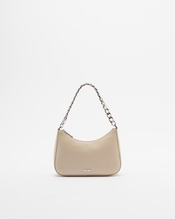 DKNY taupe bag in synthetic leather with a grained effect. Silver chain strap and metal logo on the front.