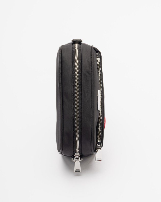 Black crossbody bag decorated with exclusive DKNY patches. Adjustable strap with embossed logo.
