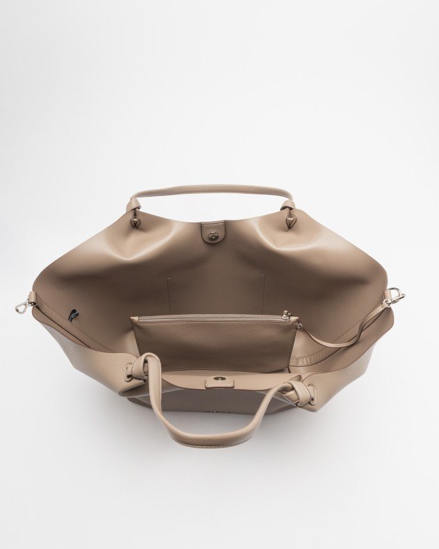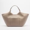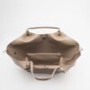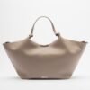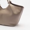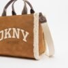 Taupe synthetic leather suitcase with gold DKNY logo and knot detail on the handles.