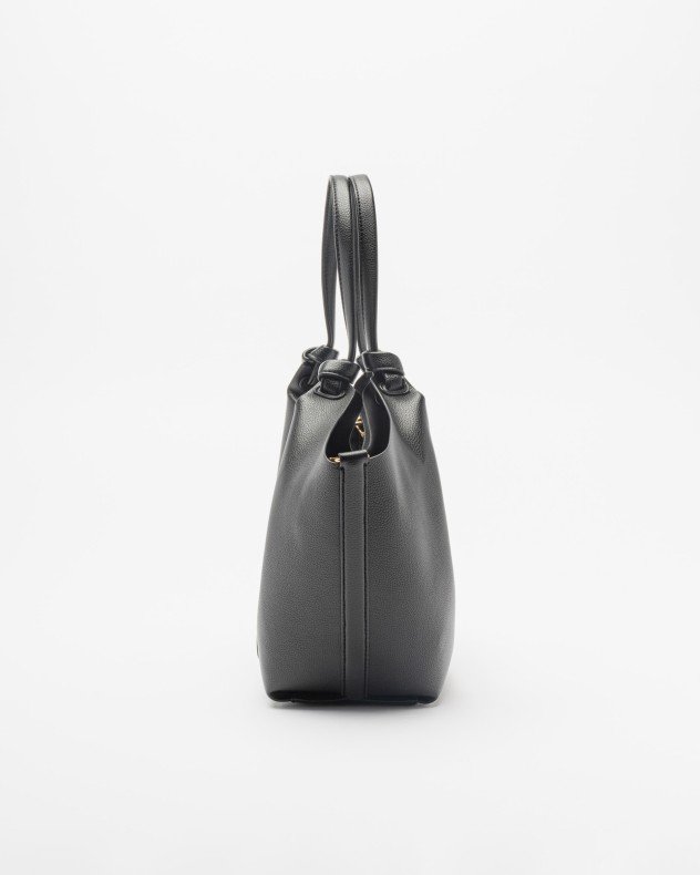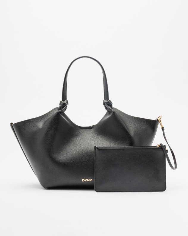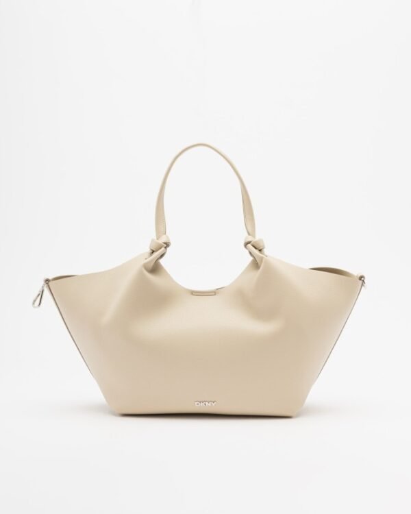 Cream beige faux leather bag with DKNY golden logo and knot detail on the handles.
