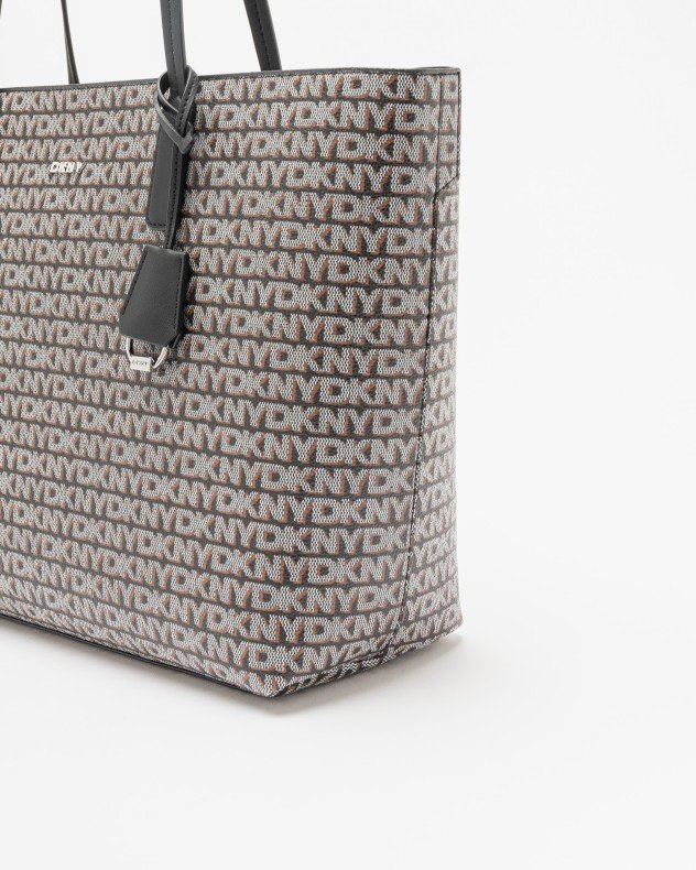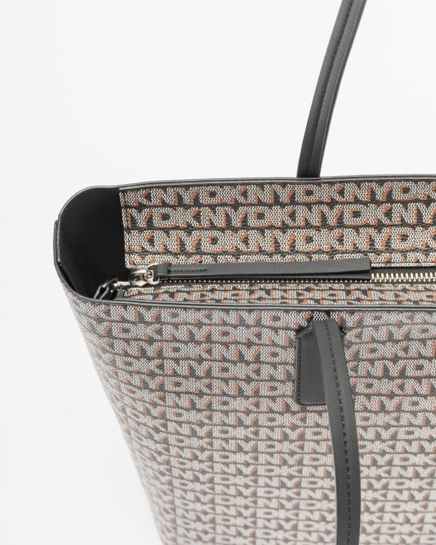 DKNY light camel shaded shopper bag in faux leather with contrasting monogram print and DKNY metallic logo.