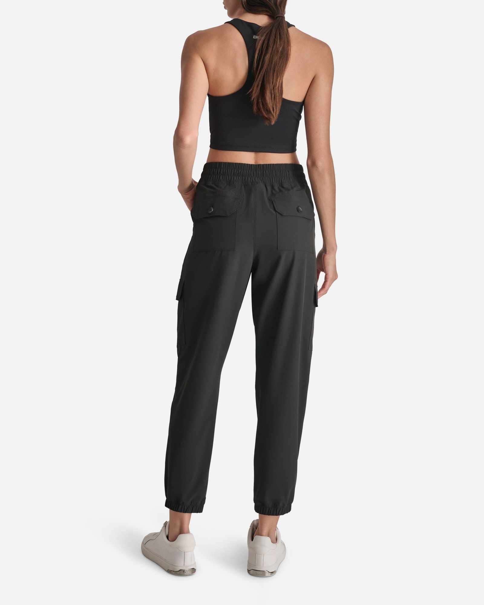 DKNY black trousers with a multi-pocket design. Elasticated waist and cuffs at the ankles.