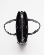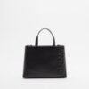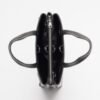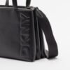 Black faux leather bag with prominent quilted logo. Removable shoulder strap.