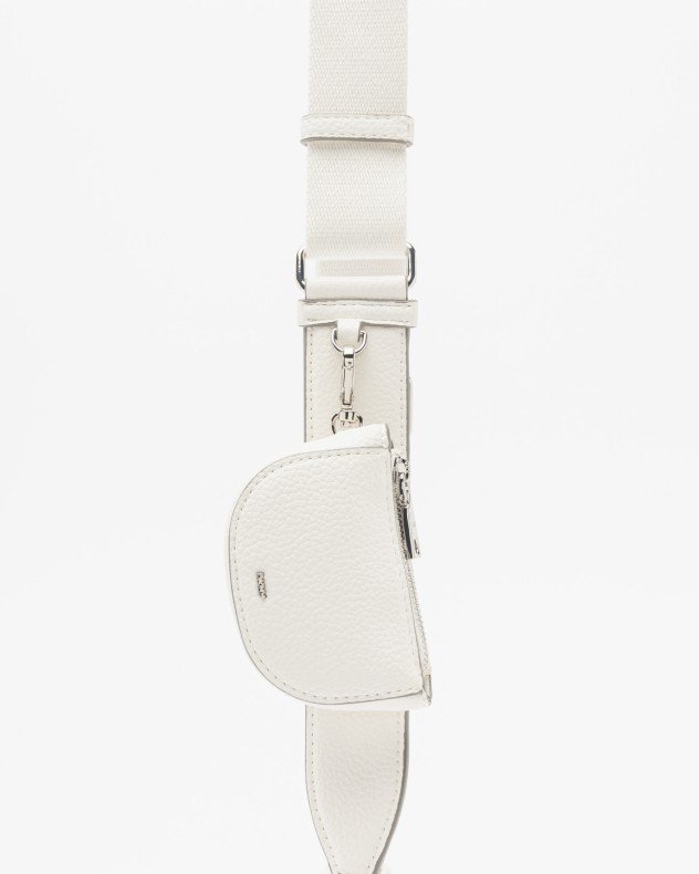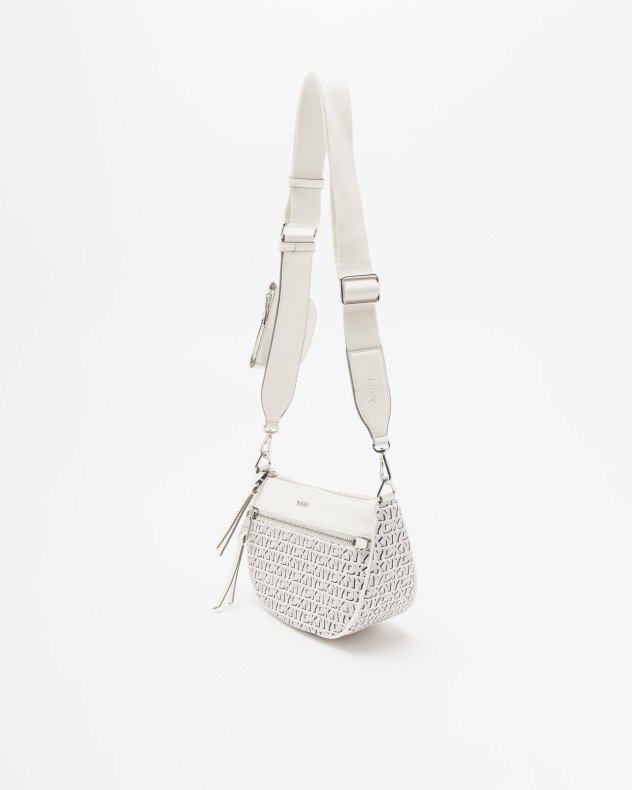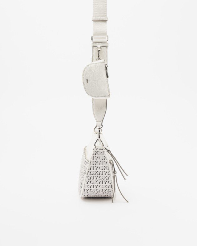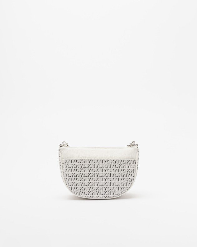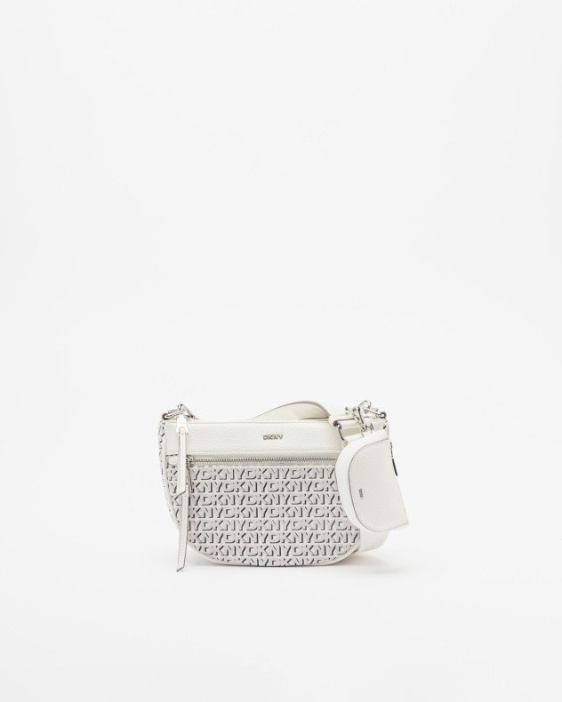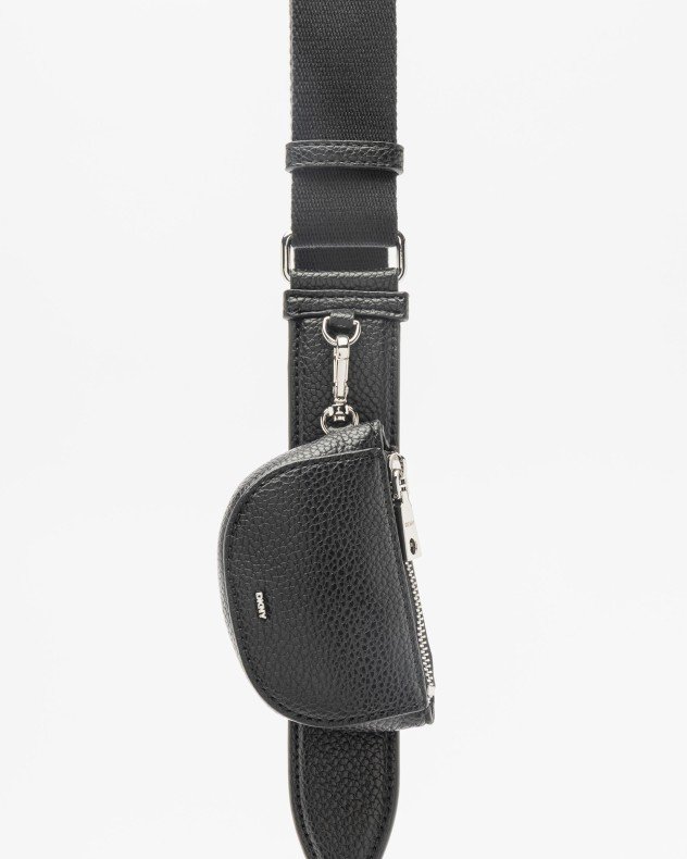 Black faux leather shoulder bag with DKNY monogram pattern in contrast. Metallic logo and exterior pocket on the front.