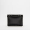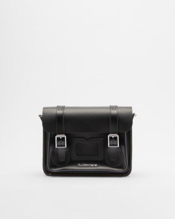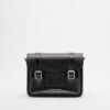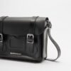 Black bag in a blend of Kiev and Smooth leathers. Details include yellow stitching, a buckle, and a metal logo on the front.