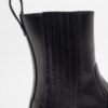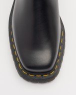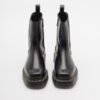Black boots in polished leather with a square toe and unique yellow stitching. Side zip fastening.