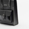 Black backpack in soft-gloss Kiev leather with a laptop sleeve inside. Yellow stitching details and a metallic logo on the front.