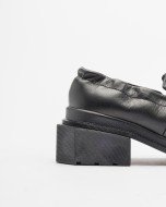 Black leather loafers with a crinkled design and square toe. All-black outsole with signature Dr. Martens features.