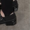 Black leather Dr. Martens shoes with an exclusive buckle and square toe. The sole is marked with a characteristic groove pattern.