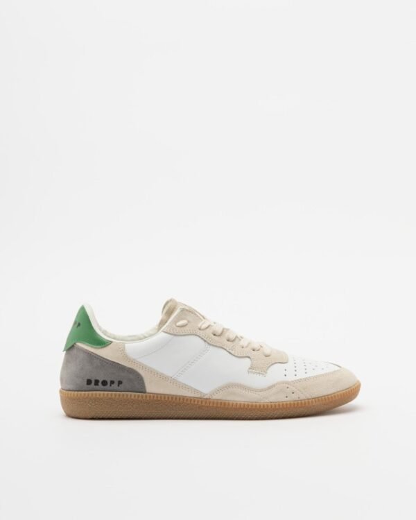 White leather sneakers with suede inserts and contrasting details. DROPP logo printed on the heel and side.