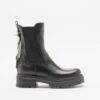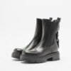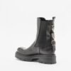 Black leather Chelsea boots with buckle and metallic details at the back. Rounded toe and chunky sole.
