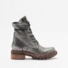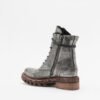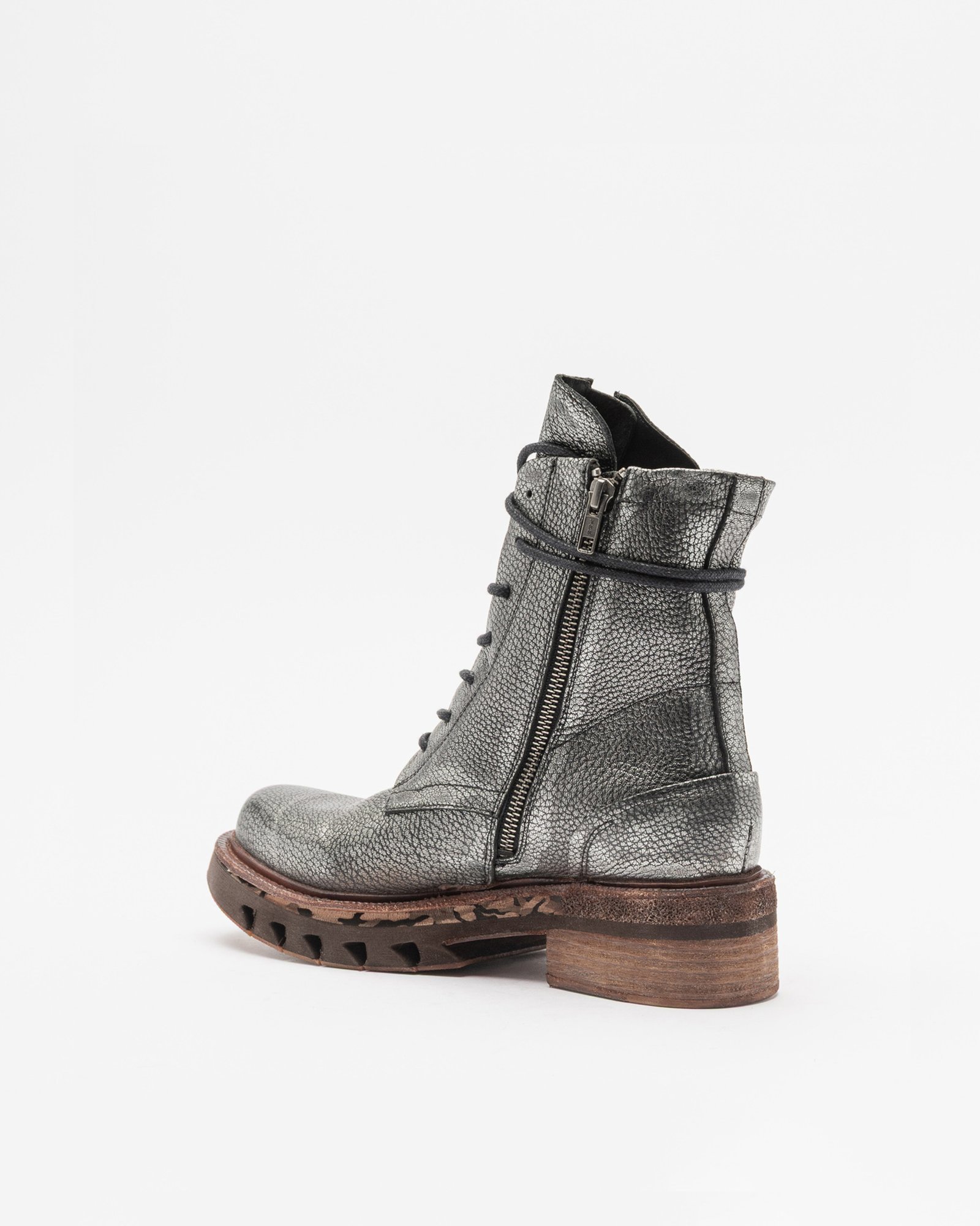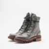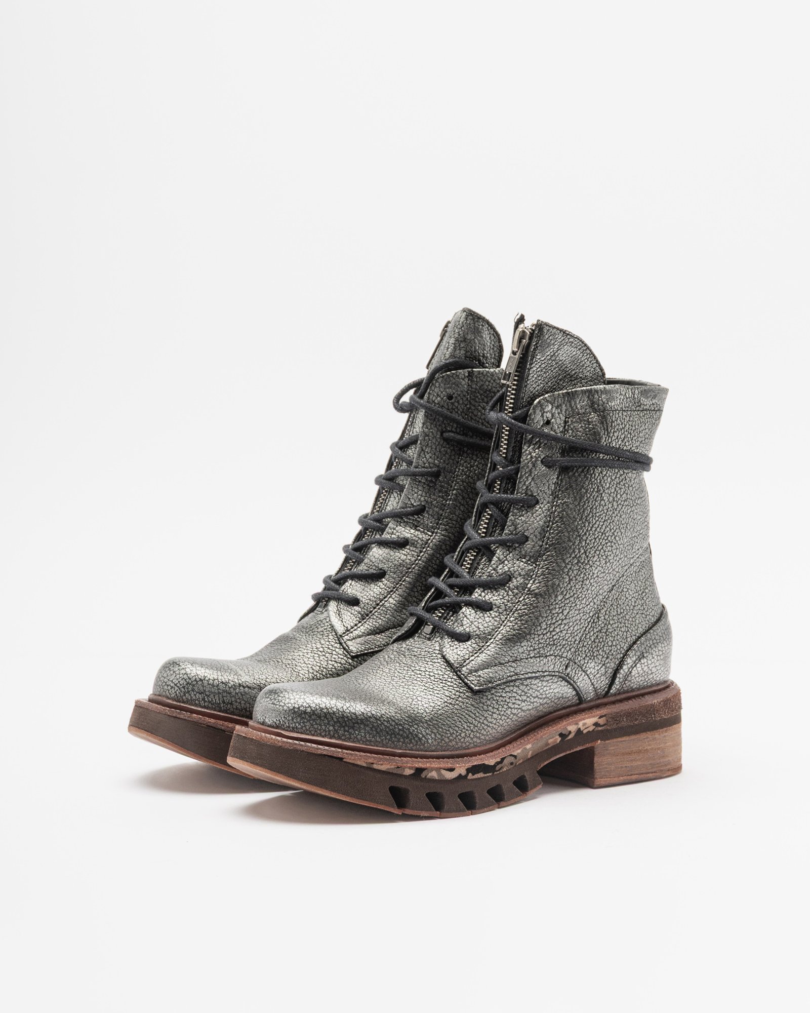Lead-colored leather boots with a matching sole. Lace-up closure and front zipper detail.