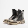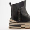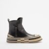 Black leather ankle boots with side zip detail and reinforced toe cap. Irregular platform sole with a distressed effect.
