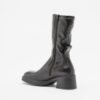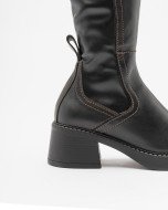 Black Miista boots with a square toe and mid-heel. Flexible, malleable shaft with stitching details.