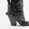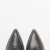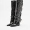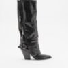 Black high barrel boots in leather with zipper closure and decorative buckle on the side. High heel and pointed toe.