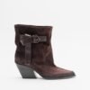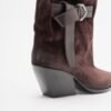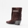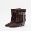 Burgundy suede ankle boots with a high heel and pointed toe. Leather strap down the side with a buckle.