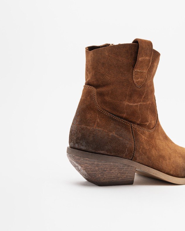 Camel suede ankle boots with croco effect. Designed with a pointed toe and medium layered wooden heel.
