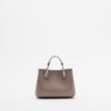 Taupe faux leather bag with a grained effect and gold accents. Wide strap with logo on the inside.