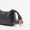 Black faux leather shoulder bag with a grained effect and gold accents. Wide strap with logo on the inside.