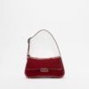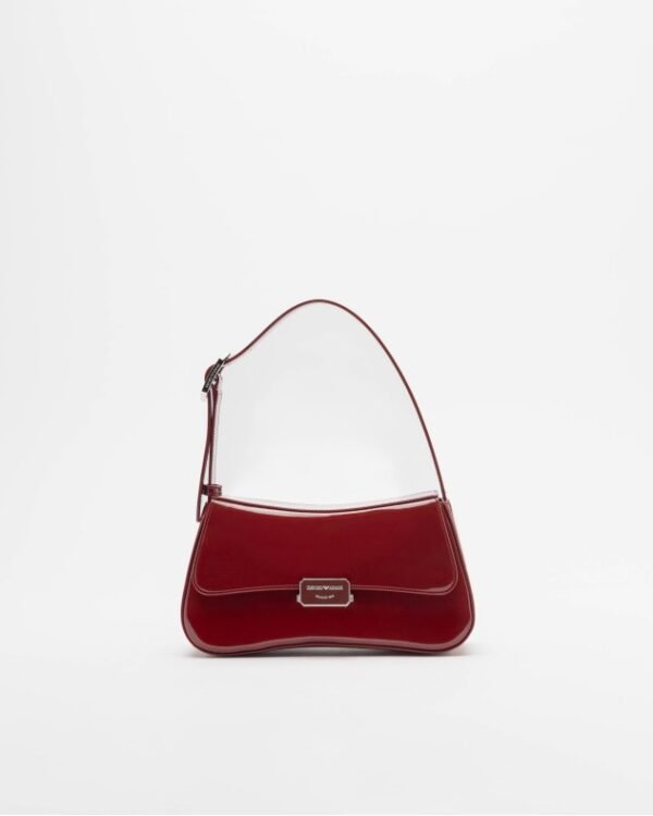 Burgundy shoulder bag with a patent finish. Adjustable strap with buckle and silver-tone plate on the front with an engraved Emporio Armani logo.