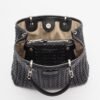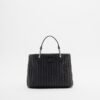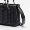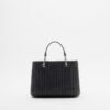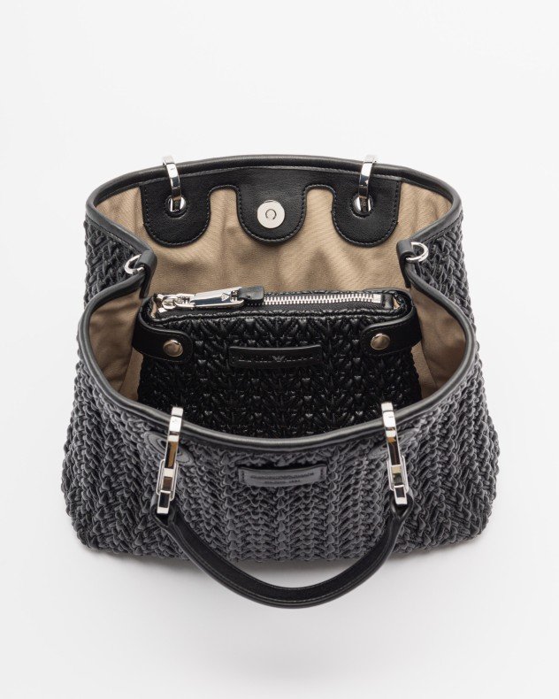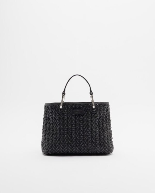 Black Emporio Armani tote bag in synthetic leather with a woven effect and leather strap detail featuring the Emporio Armani logo.