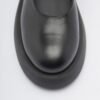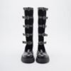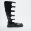 High-top black boots made of leather. Rounded toe and open front with buckles.