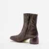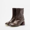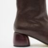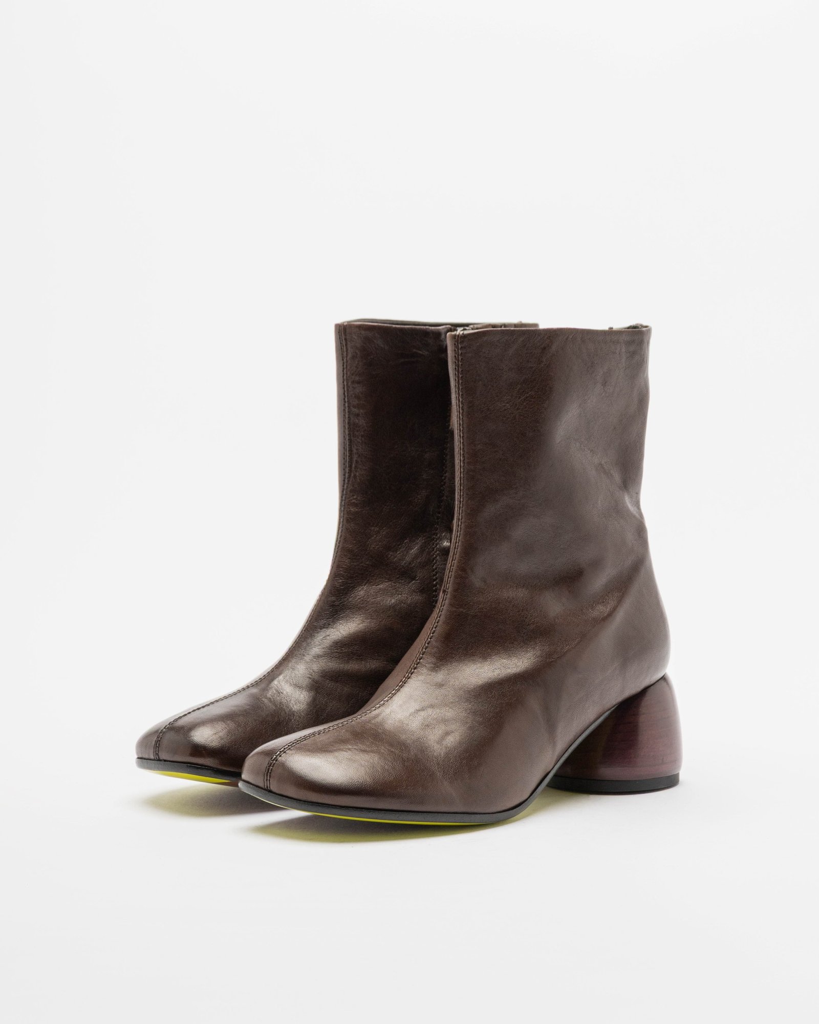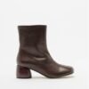 Brown leather ankle boots with a square toe and cylindrical wooden heel. Center seam and side zipper.