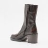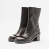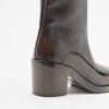 Botas Ernesto Dolani construídas em couro castanho com biqueira arredondada e salto bloco. Detalhe laminado com pesponto.