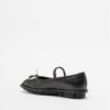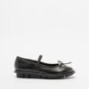 Black leather shoes with a bow at the front and an elastic strap across the instep.