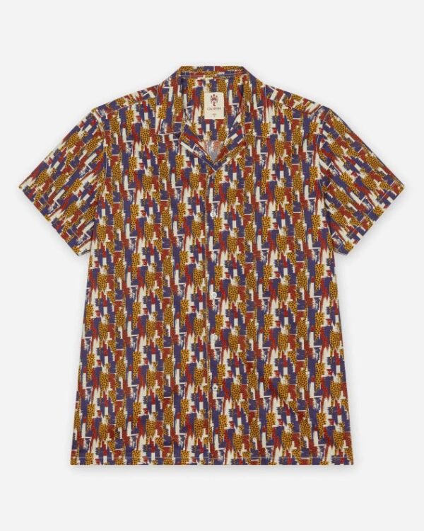 Short-sleeve shirt in multicolour with an abstract ikat pattern in blue, red, ochre and beige tones.
