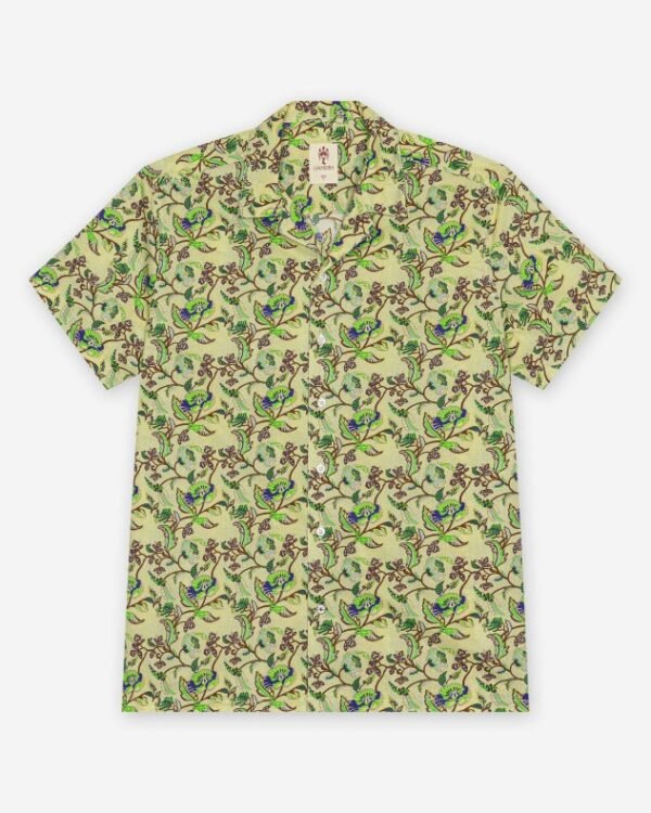 Short-sleeved shirt in a yellow-green color with a botanical floral pattern in shades of green, blue, and brown.