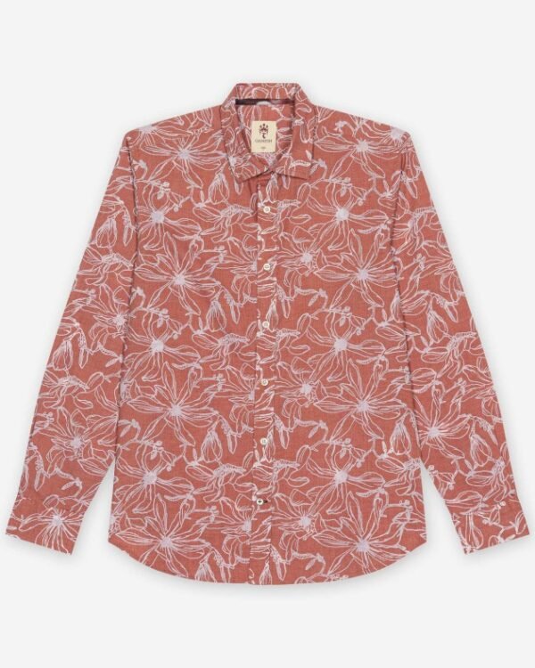 Long-sleeve shirt in terracotta with an illustrative floral pattern in light pink outline.