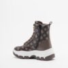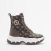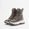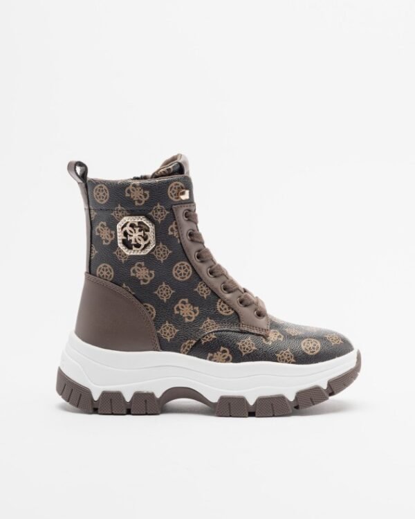 Brown GUESS boots with a high, chunky platform sole. Upper featuring peony logo pattern and shiny metallic detailing.