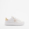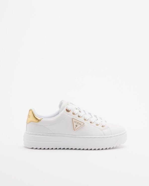 White sneakers in smooth leather with gold details and a metallic GUESS logo on the side.