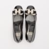 Black leather stilettos with a pointed toe and a silver letter G applied to the heel.
