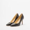 Black leather stilettos with a pointed toe and a gold letter G applied to the heel.