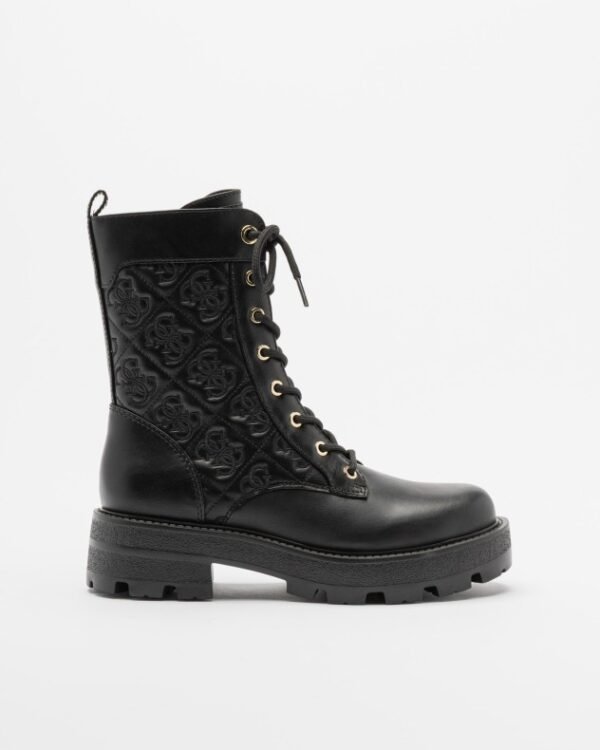 Black faux leather boots with a quilted effect and GUESS monogram pattern. Lace-up closure and side zipper.