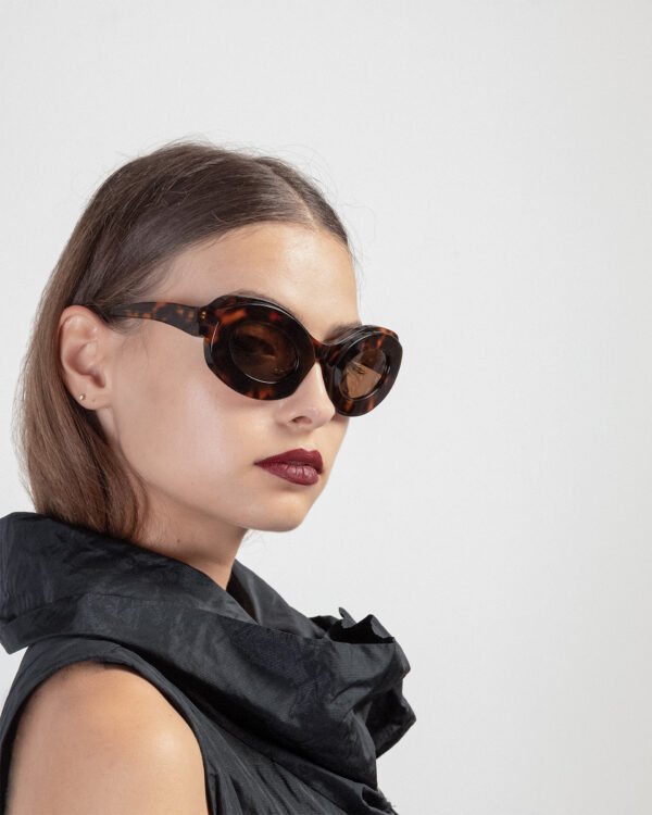Brown sunglasses with abstract oval shape and Tortoise pattern.