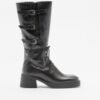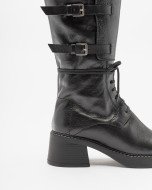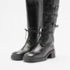Black leather boots with square toe and medium heel. High barrel with attackers and three metal buckles on the side.