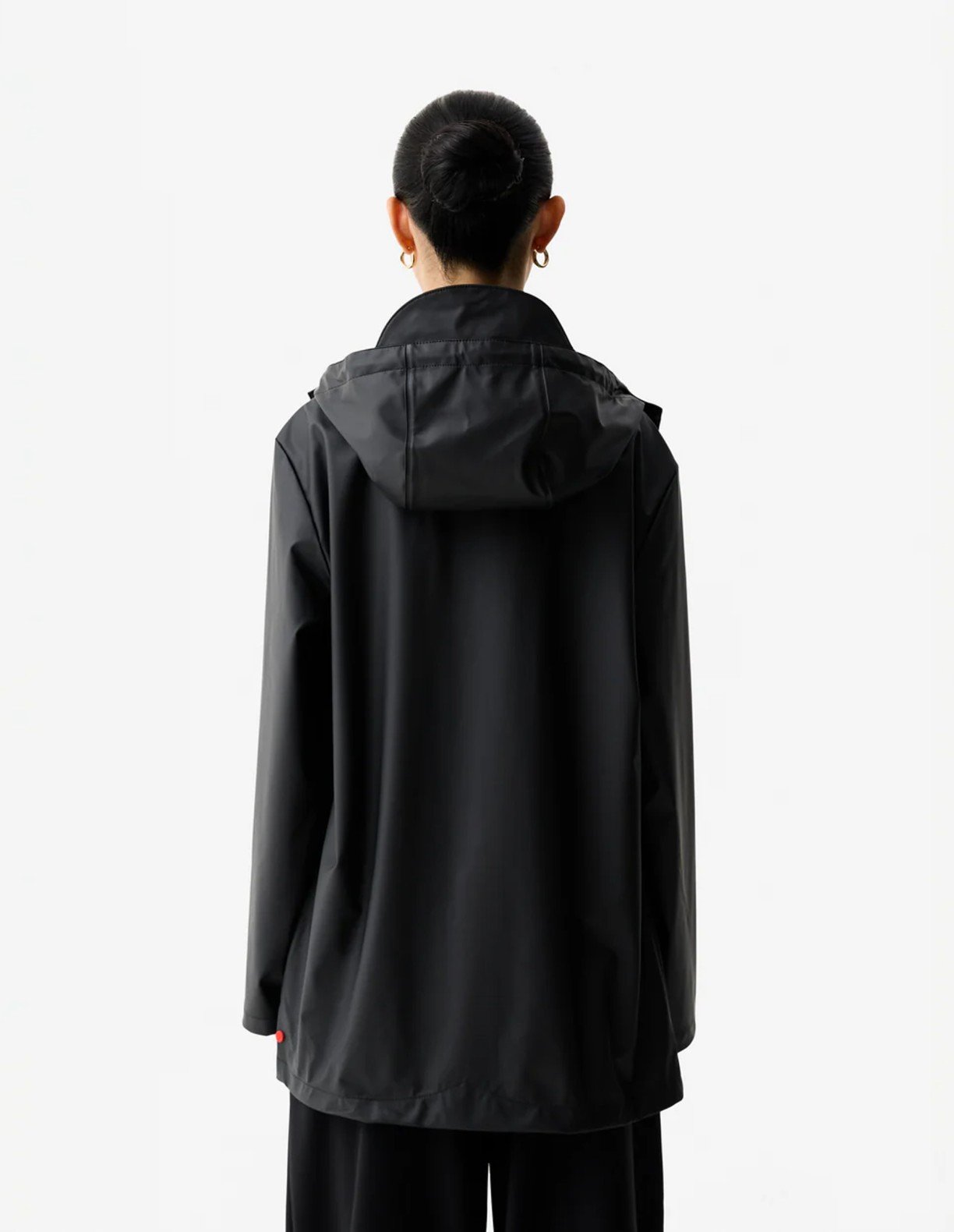 Women’s black parka with adjustable hood. Hunter rubber patch with red trim.