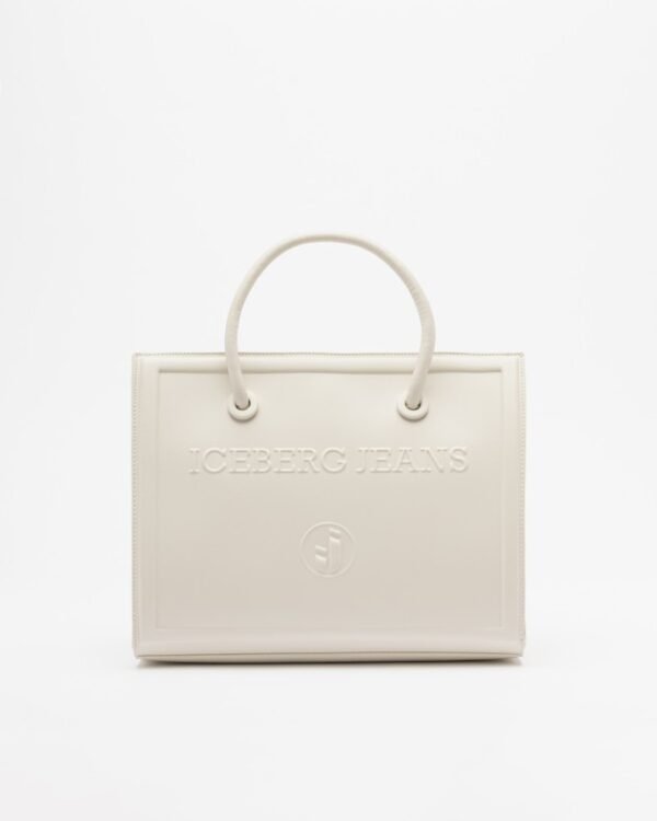 Iceberg Jeans beige tote bag in smooth synthetic leather with a semi-rigid structure and embossed Iceberg Jeans logo.